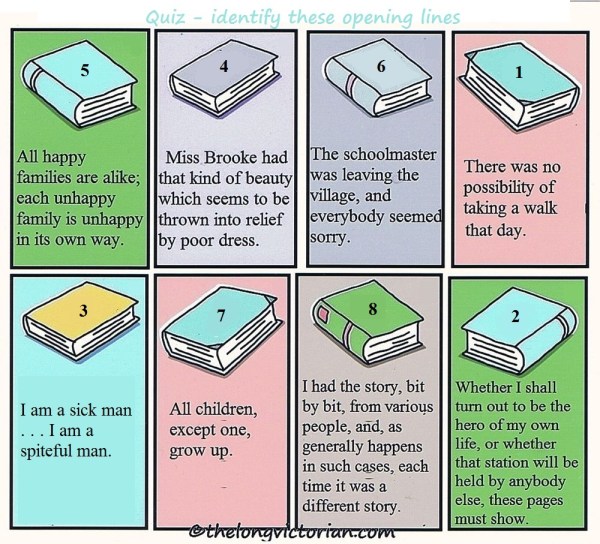 Can you identify these famous opening lines? [Answers below] Answers: Jane Eyre by Charlotte Brontë (1847) David Copperfield by Charles Dickens (1850) Notes from Underground by Fyodor Dostoyevsky (1864) Middlemarch by George Eliot (1871) Anna Karenina by Leo Tolstoy (1878) Jude the Obscure by Thomas Hardy (1895) Peter Pan by J.M. Barrie (1911) Ethan Frome... Continue Reading →